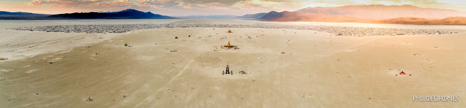 La Playa, cette étendue au centre du U formé par les camps et autres emplacements où les burners vont s'installer pour la semaine.On découvre la Flower Tower (au 1er plan, tour noire), puis dans l'axe: le Temple et un peu plus loin le Man reconnu avec sa base rouge et son toit doré type pagode.