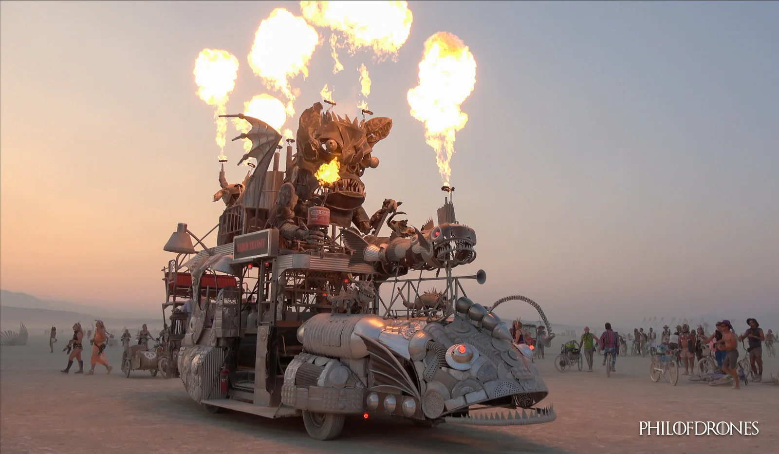 Enfin le samedi soir , le Man va bruler (Burning Man), l'immense majorité des Burners viennent autour du Man , et les arts cars font un cercle autour. La Musique bat son plein et BOUMMMMMM ...