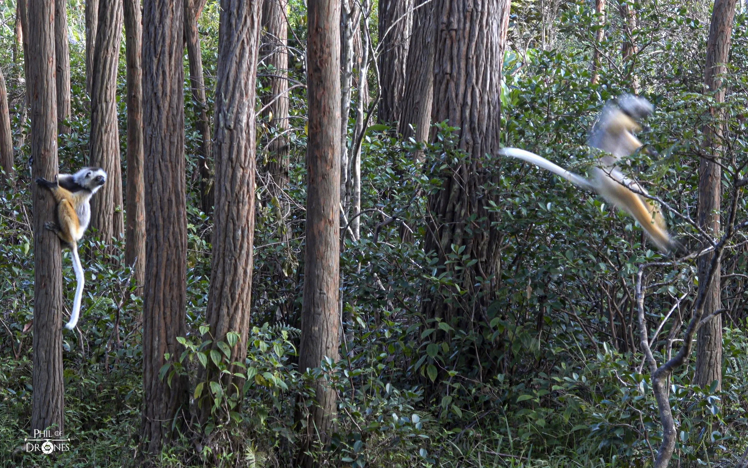 Le Sifaka à tête blanche et face noire, Ce sont de grands lémuriens diurnes, au pelage dense variant du blanc pur au noir profond en fonction des espèces, et dotés d'une queue plus longue que leur corps. Comme tous les lémuriens, ils sont endémiques de l'île de Madagascar. photo 2 et 3. avec un cri strident (dans vidéo 2). Sévèrement menacés par la destruction de leur habitat.Ils vivent en groupes paritaires d'une dizaine d'individus et communiquent au moyen de signaux vocaux, visuels et olfactifs. Les femelles donnent naissance à un seul petit par année, qu'elles transportent pendant près de six mois sur leur ventre, puis sur leur dos.